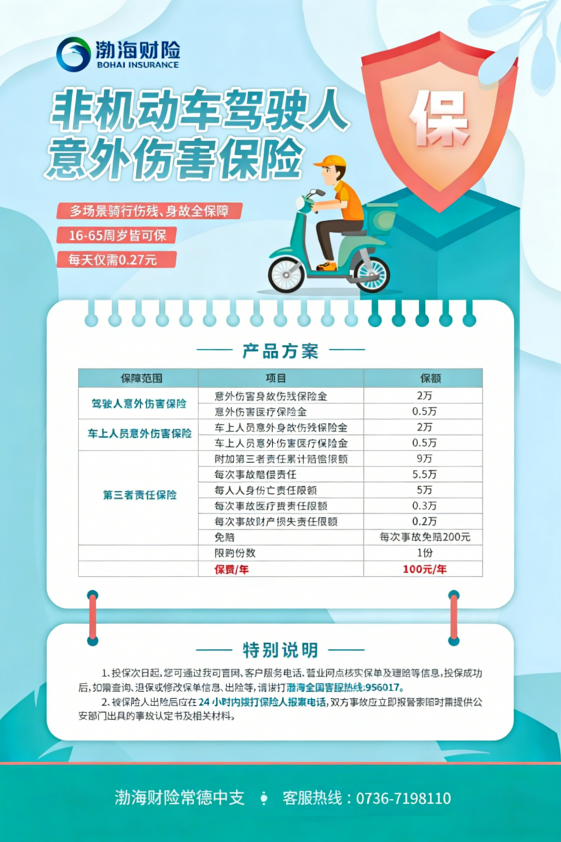 100元/年的保费,换算下来每天仅需0.27元,却能换来一整年的安心。渤海财险作为正规保险公司,以专业的服务和可靠的赔付,为骑行者们保驾护航。您可以通过渤海财险常德中支线下咨询,拨打服务热线0736-7198110了解详情。